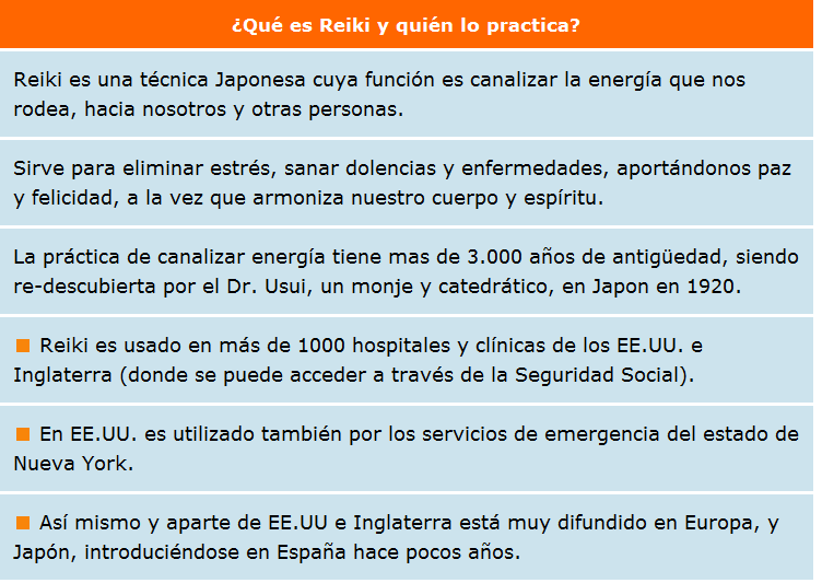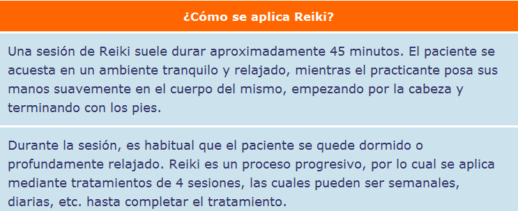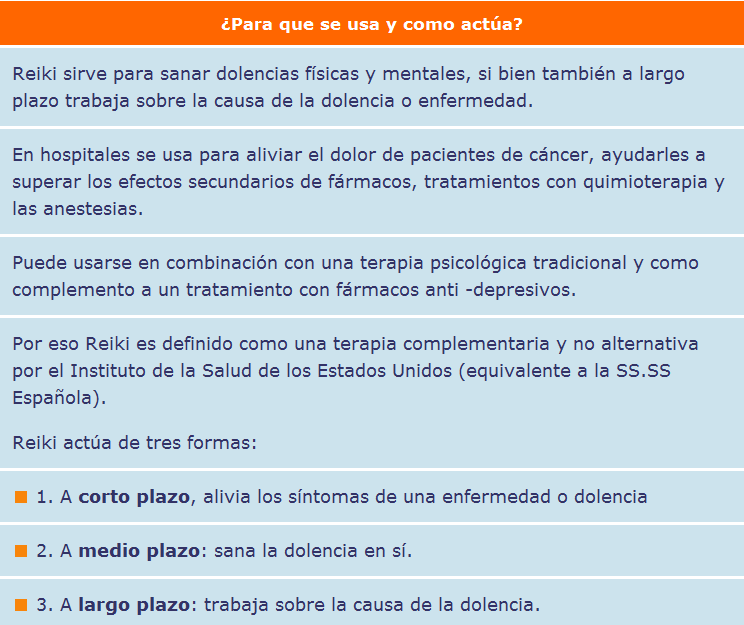 El Reiki nos permite aplicarlo tanto a nosotros mismos como a otras personas y nos permite liberar tensión, estrés, ansiedad, preocupaciones entre otros conflictos energéticos. No es necesario tener ningún don para practicarlo, no tiene ningún tipo de afinidad religiosa, ni ideología y es una practica terapeutica reconocida por la organización mundial de la salud y utilizada en clínicas y hospitales de todo el mundo como terapia complementaria a la medicina convencional. (por ejemplo en España, Ramón y Cajal, Puerta del Hierro, Vall de hebrón, 12 de octubre etc o la prestigiosa Clínica Anderson de Estados Unidos..)